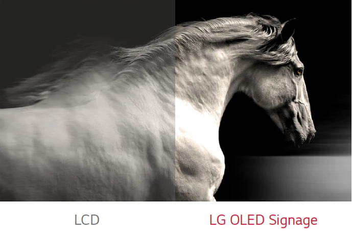 Equipped with over 8 million self-lighting pixels operating inpidually, OLED Signage reproduces absolute blacks with no light bleed and offers infinite contrast.