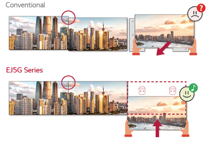 The overall installation process of the wallpaper OLED has gotten much easier. Once the dedicated wall fixers are driven into a wall, a display can be easily hung on them. Video wall tiling has become more convenient, thanks to its front installation feature, which departs from the conventional side-sliding method.