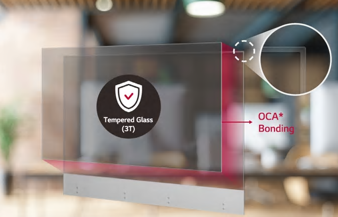 Touching a display directly can cause damage or scratches. The tempered front glass protects product from such external impacts and its anti-shatter glass is designed to minimize customers’ injuries.