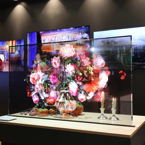 Featuring self-lighting pixels, the display maintains vivid colors and high contrast ratio even when the display becomes transparent. It brings content to life from wide viewing angles, and the content blends into its surroundings seamlessly and naturally.