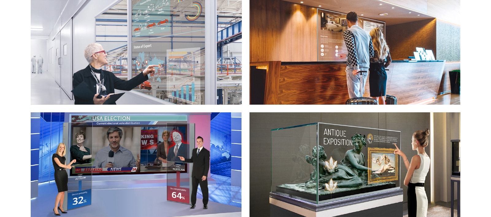OLED technology makes the Transparent OLED Signage have slimmer structure without backlight unit nor a liquid crystal layer, achieving high transparency of 38% much higher than conventional LCD transparent displays (10%*). While clearly showing objects behind the screen, it overlays the relevant information right before them.