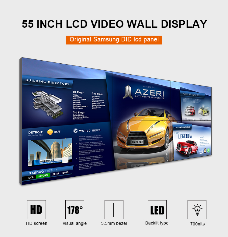 | 1 | 55" Samsung 3.5mm bezel | 700nits brightness,WLED Backlit,1920x1080 resolution,with 1080P HDMI input | |