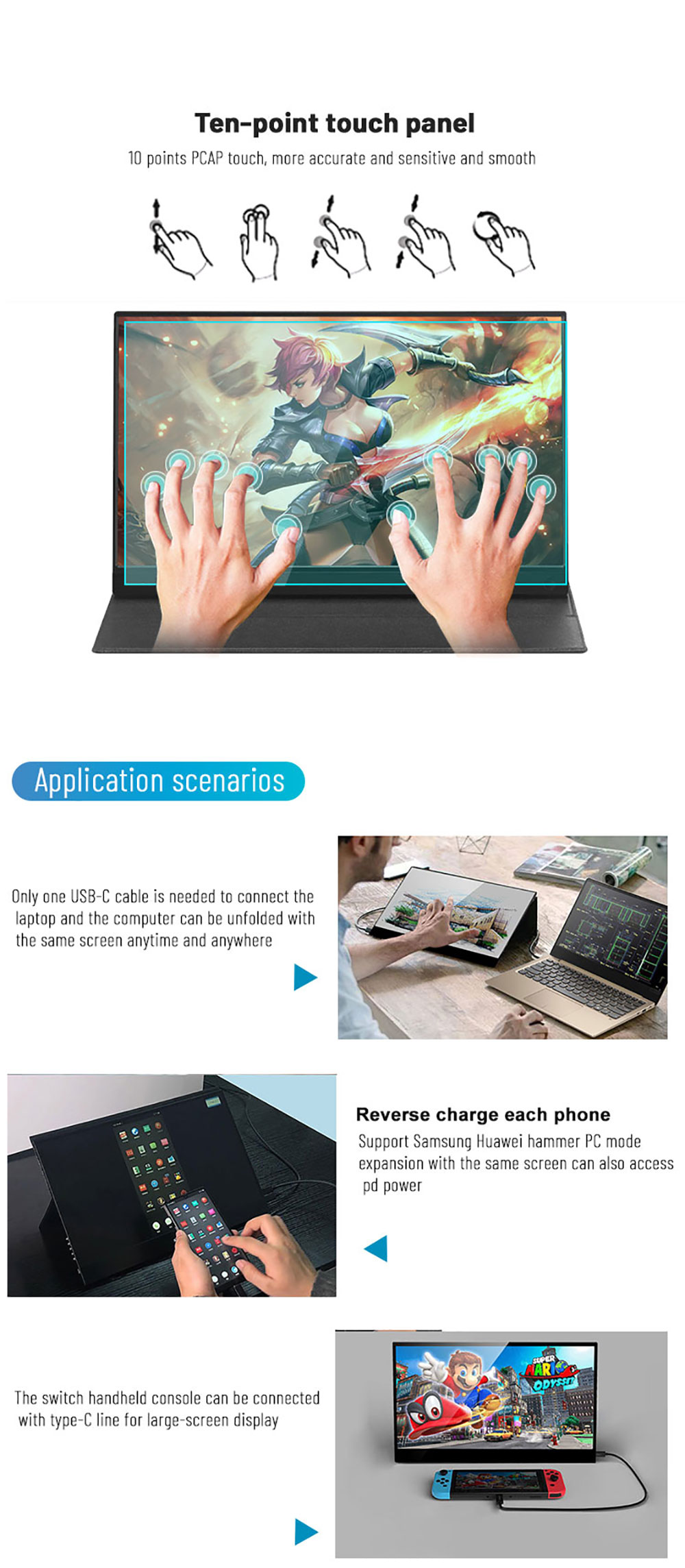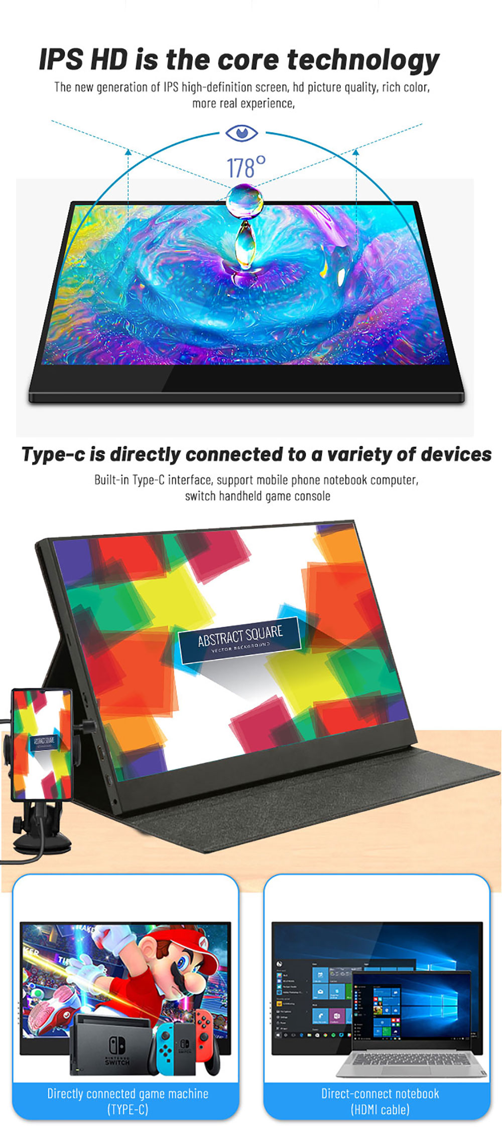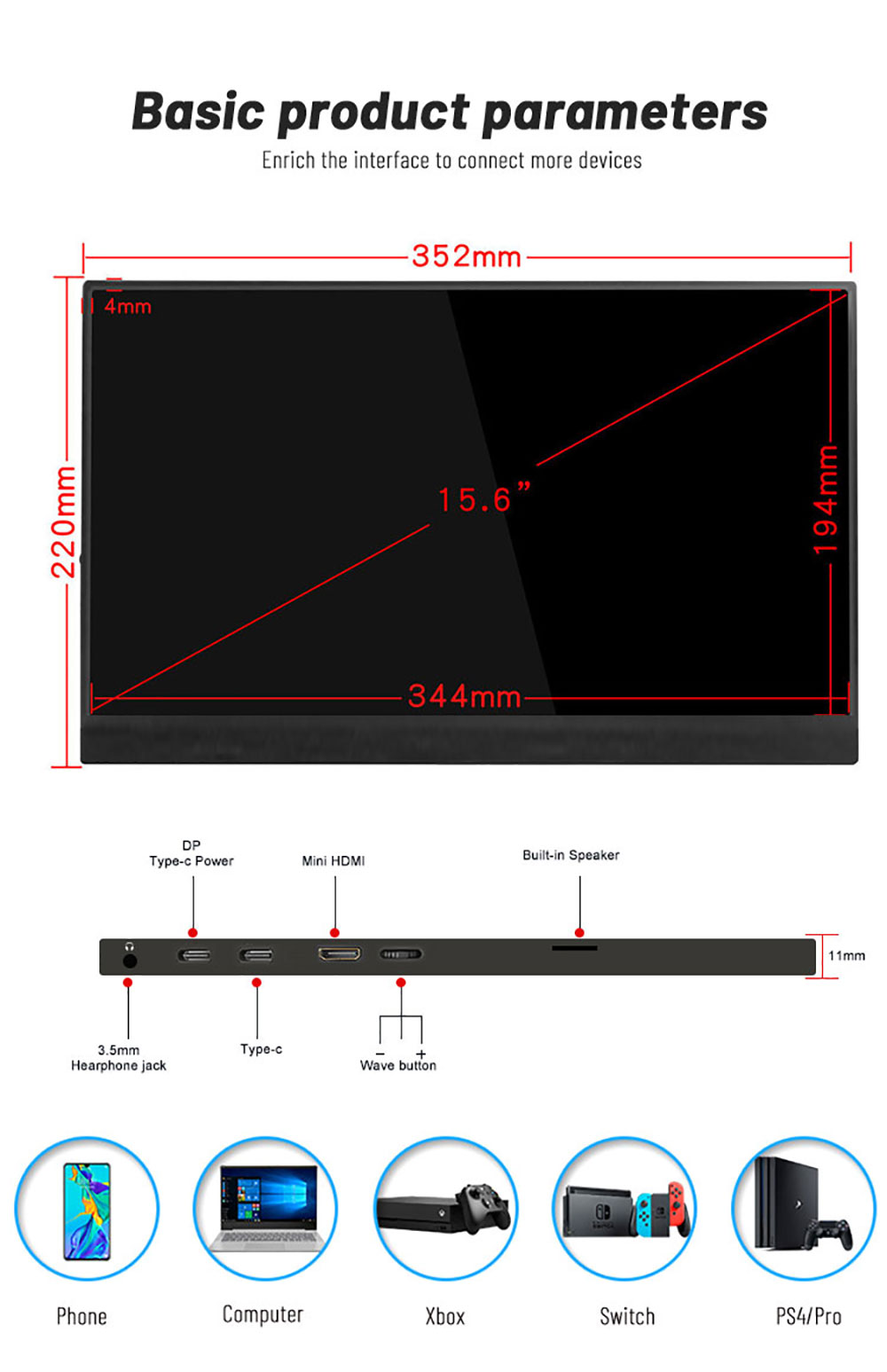 | Product interfaces | TYPE-C(Signal input) *1 MiniHDMI(Signal input) *1 Type-c (power input)1 3.5mm(Audio input) *1 |
